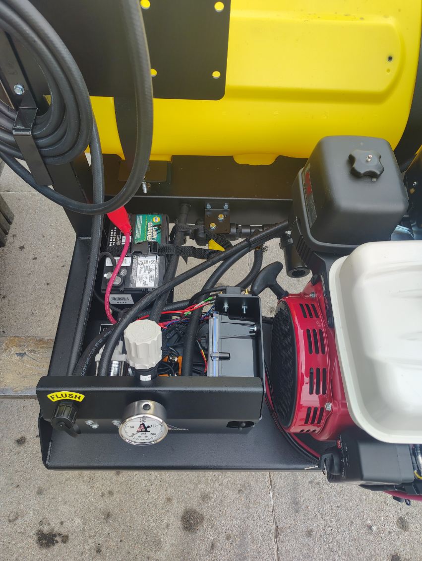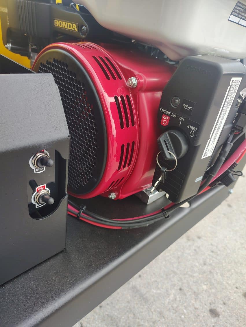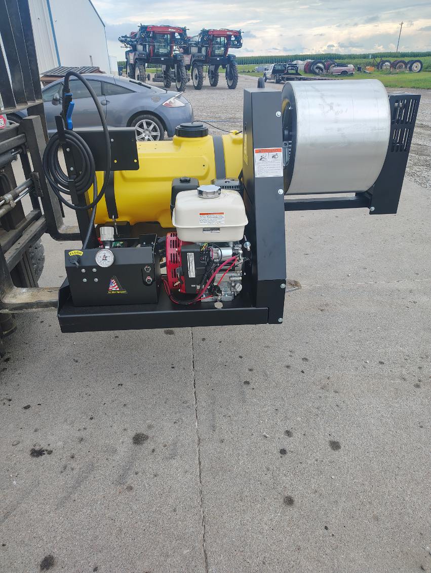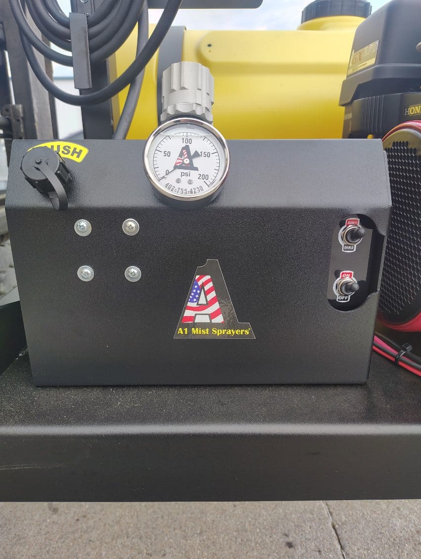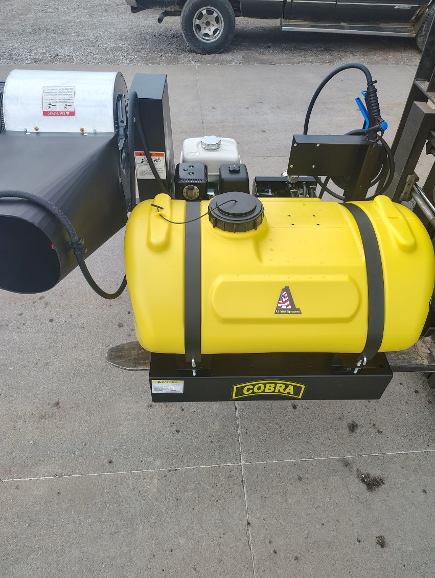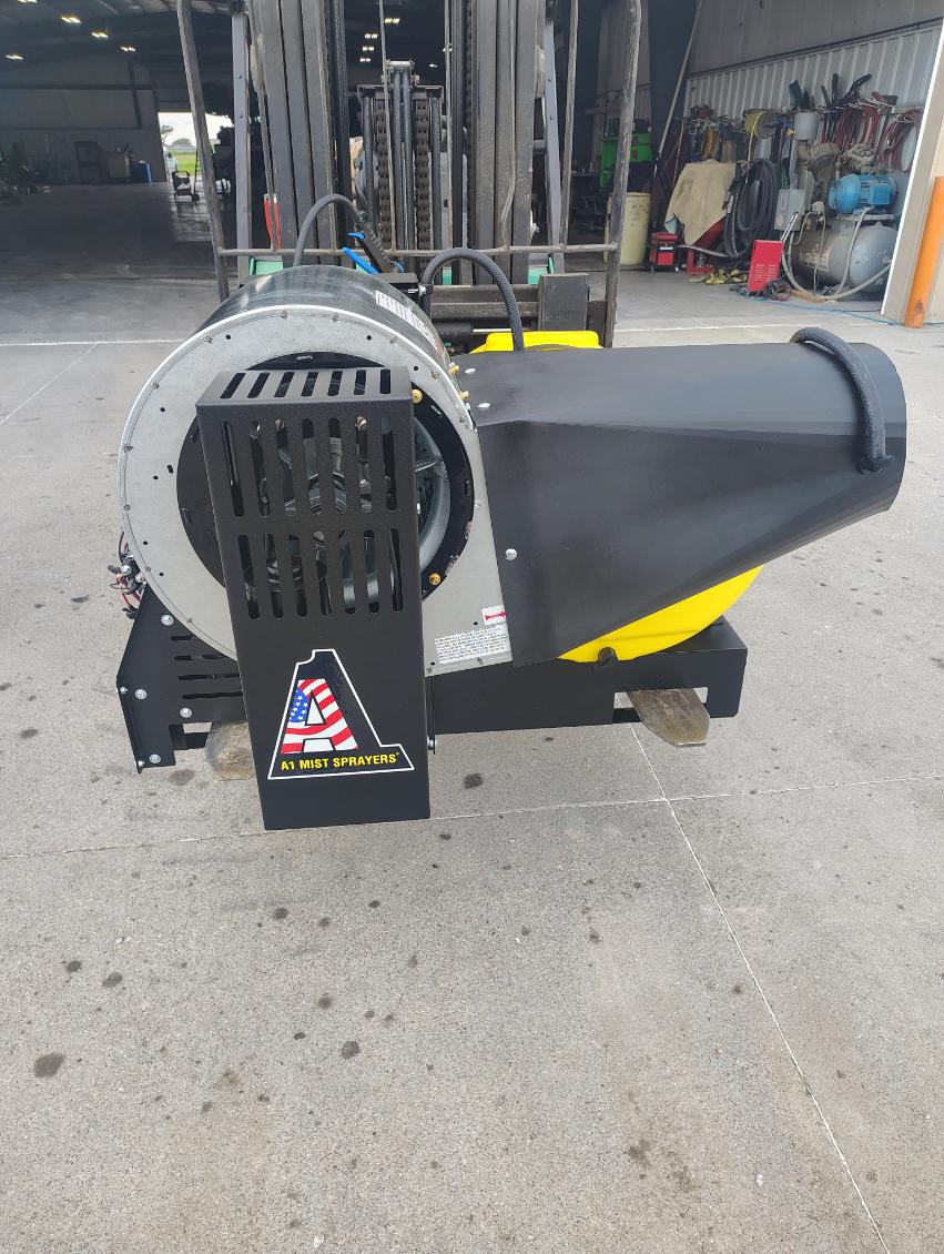 A1 Exclusive 40 Gallon Mist Sprayer with Hand Sprayer, 2-Nozzle Volute w/ Cone Shaped Pattern, 70Ft Vertical and 95Ft Horizontal Throw Pattern, 15″ Huck Riveted, 210 Degree Rotating Electric Fan, 8HP Fuel Efficient Honda Engine, Hypro 10gpm Roller Pump, Electronic Remote Controlled, List Price $6650, Sale Price $6150